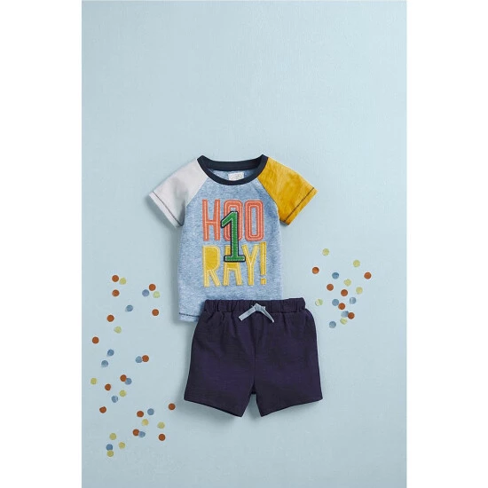 - Colorblock patterned tee with crew neckline, short raglan sleeves, slub jersey applique with printed and embroidered #double;Hooray 1#double; detail at front and pull-over styling