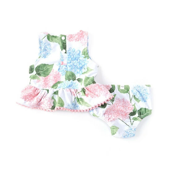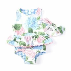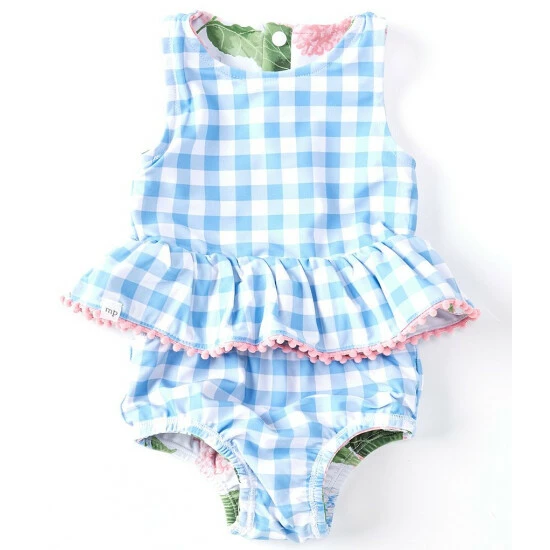 - Hydrangea/gingham printed swim top with scoop neckline, sleeveless styling, button back closure, and ruffled, peplum style hem with pom pom trim