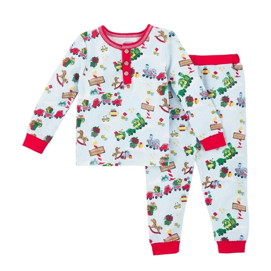 - printed long-sleeve pajama top, solid Henley neckline and cuffs, plus long sleeves and wooden-button placket