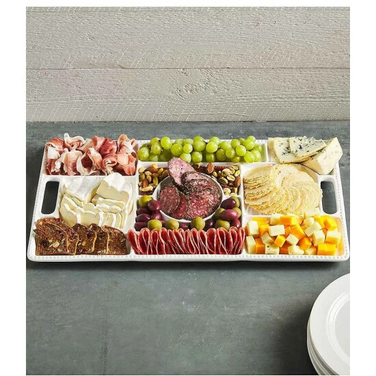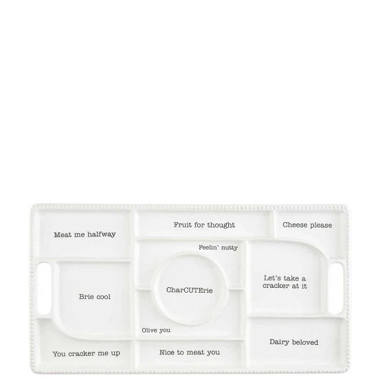 From Mud Pie, this 11-section beaded ceramic charcuterie tray with side handles features:Β