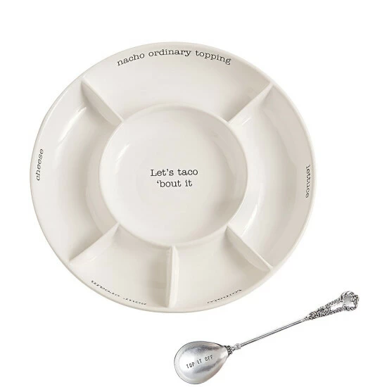 - sectioned ceramic server with taco topping labels and #double;nacho ordinary topping#double; and #double;let’s taco ’bout it#double; messages