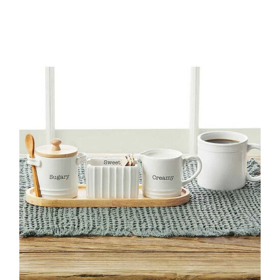 From Mud Pie, this cream and sugar set with tray features:ย