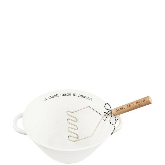 - Sentiment wording on each:ย bowl – #double;A mash made in Heaven#double;; masher – #double; Game, Set, Mash#double;