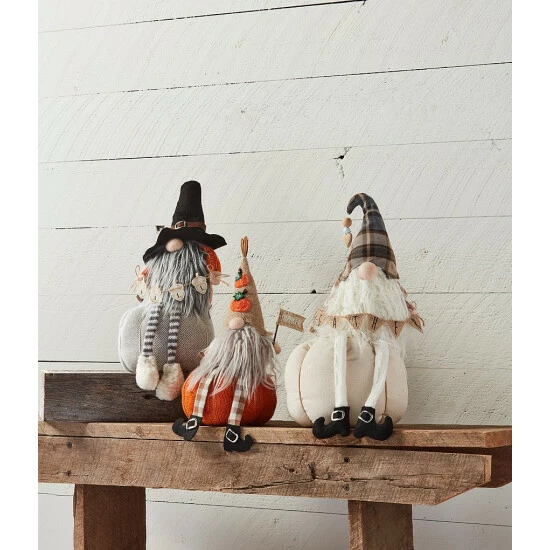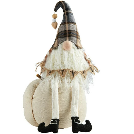- Cable knit gnome with yarn beard and felt, burlap and wood details sits on cable knit stuffed pumpkin.