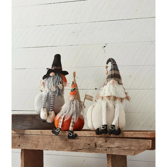 - Cable knit gnome with yarn beard and felt, burlap and wood details sits on cable knit stuffed pumpkin.