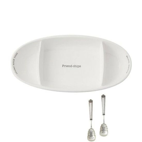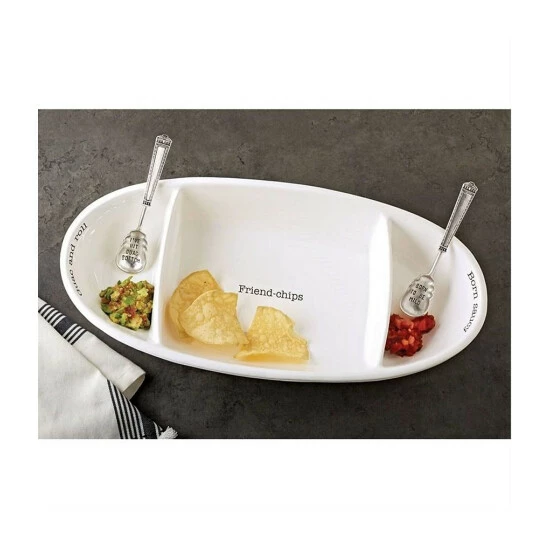 - Debossed detail on dish #double;Guac and Roll#double;, Friend-Chips, and #double;Born Saucy#double;