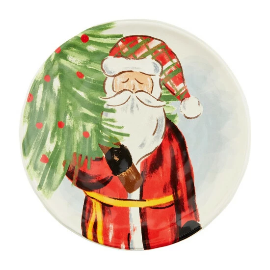 From Mud Pie, this set of Holiday Round Santa and Tree Salad Plates feature:ย