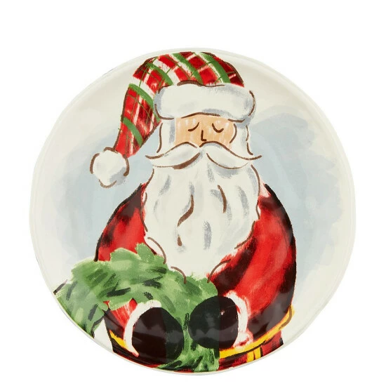 From Mud Pie, this set of holiday round Santa and wreath salad plates feature: