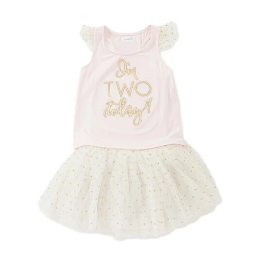 - gold glitter-dot print and metallic gold linen #double;I’m TWO today!#double; appliquΓ©