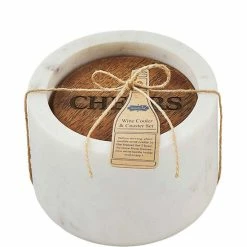 From Mud Pie, this 5-piece wine cooler and coasters set features:ย